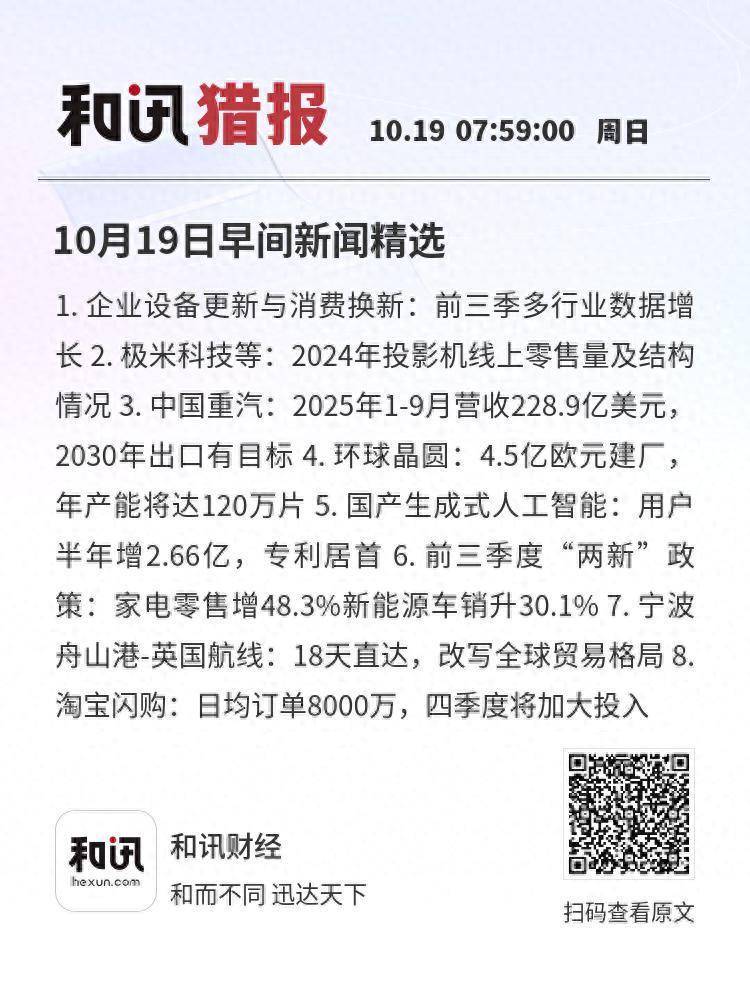 10月19日早间新闻精选1. 企业设备更新与消费换新:前三季多行业数据增长2. 极米科技等:2024年投影机线上零售量及结构情况3. 中国重汽:2025年1-9月营收228.9亿美元,2030年出口有目标4. 环球晶圆:4.5亿欧元建厂,年产能将达120万片5. 国产生成式人工智能:用户半年增2.66亿,专利居首6. 前三季度“两新”政策:家电零售增48.3%新能源车销升30.1%7. 宁波舟山港-英国航线:18天直达,改写全球贸易格局8. 淘宝闪购:日均订单8000万,四季度将加大投入
